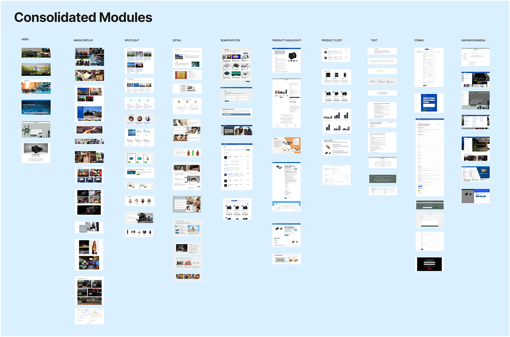 Panasonic is divided into many individual companies operating autonomously which has led to a brand-diluting number of unique looks in their web ecosystem. We were asked to do a comprehensive review of a number of these websites and interview key stakeholders with an eye toward creating a new modular design system that would allow for unique-but-related designs within corporate brand limitations.